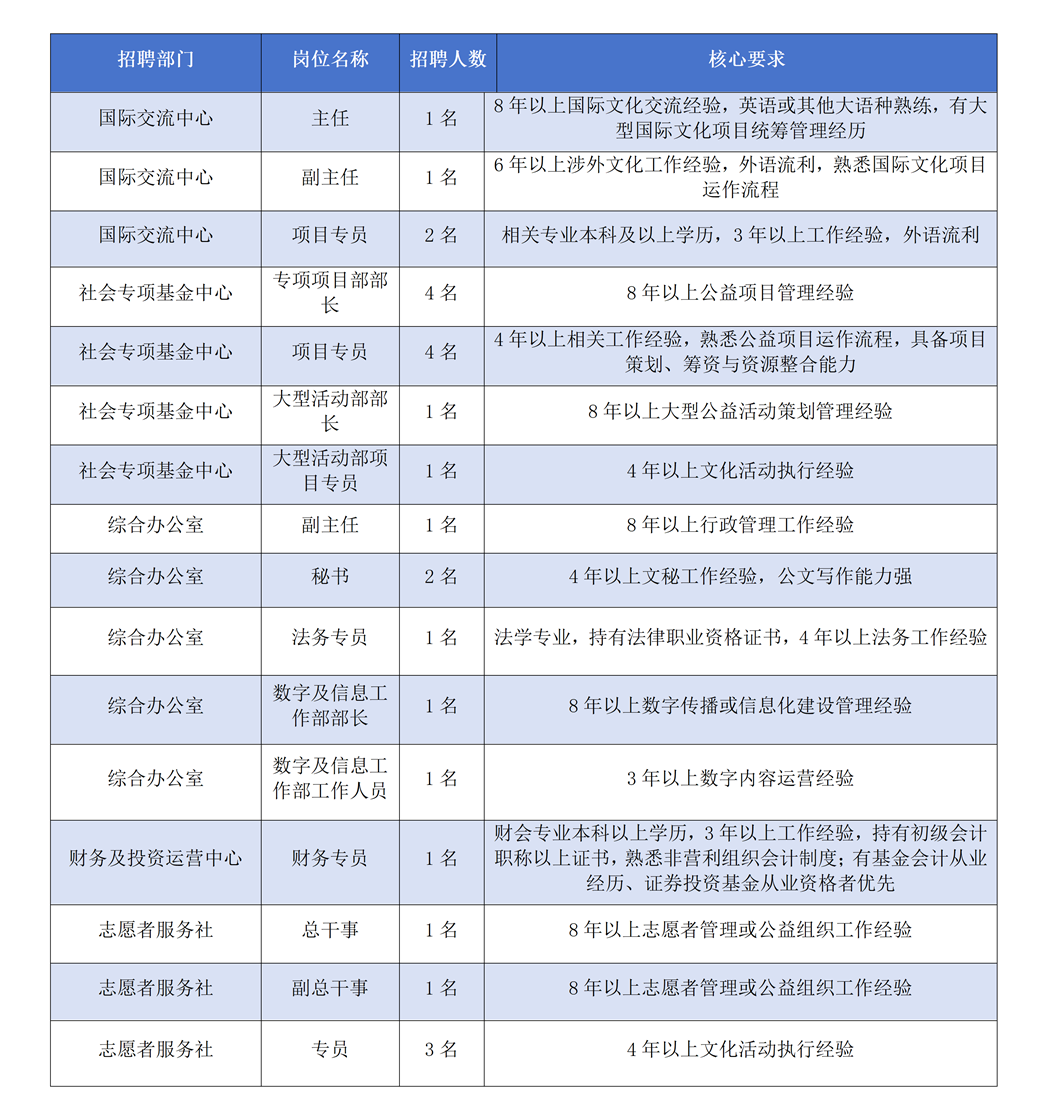中国文学艺术基金会是在民政部登记注册的全国5A级公募基金会,为加强人才队伍建设,推动文学艺术公益事业高质量发展,现面向社会公开招聘工作人员,有关事项公告如下: